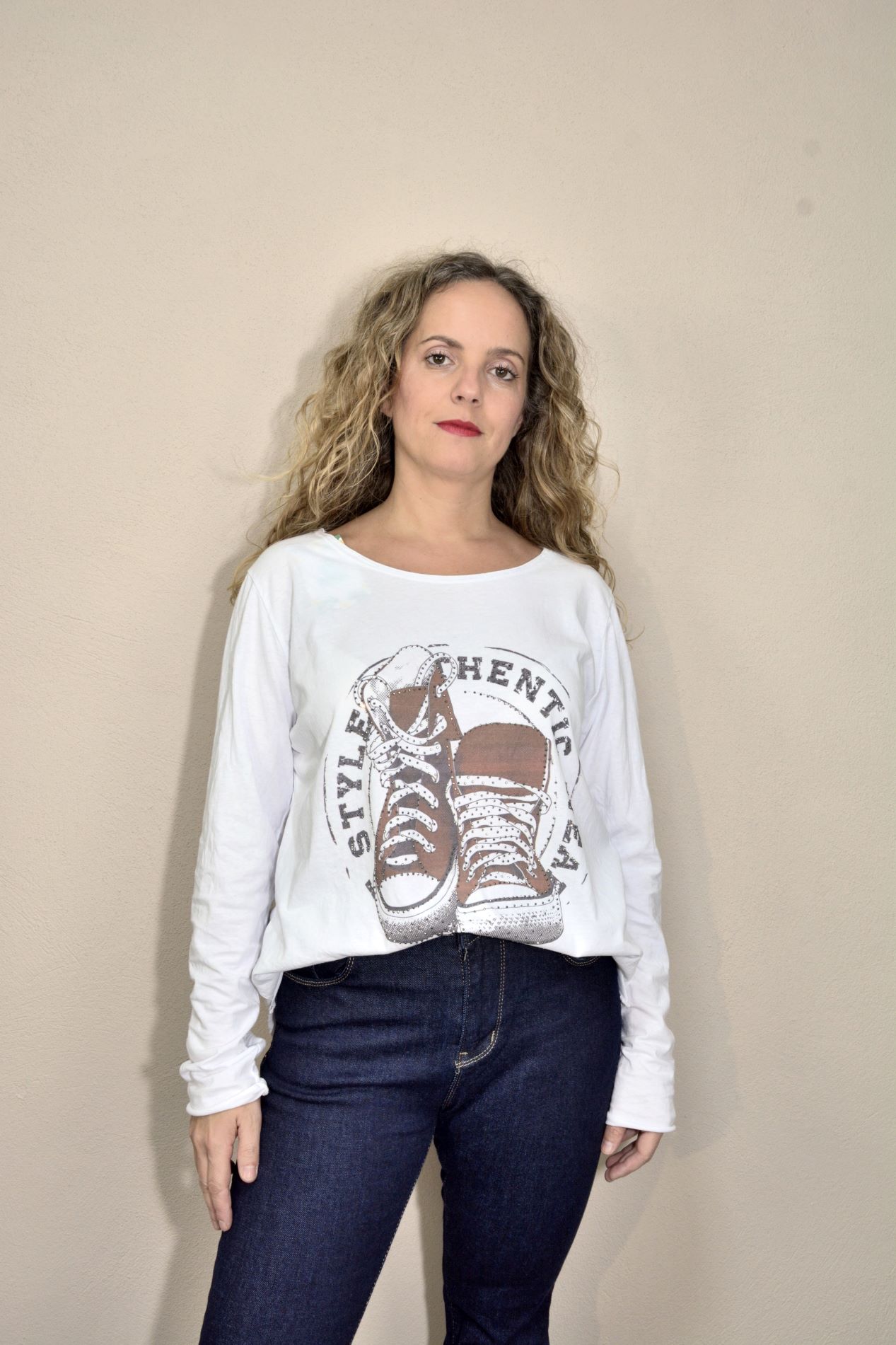 La Camiseta Zapatillas es la prenda perfecta para quienes buscan un estilo juvenil, moderno y lleno de personalidad. Diseñada para destacar en cualquier look casual, esta camiseta de manga larga combina comodidad y moda urbana en una pieza versátil que podrás usar durante todo el año. Su estampado frontal de zapatillas estilo sneaker aporta un toque dinámico y relajado, ideal para quienes disfrutan de un estilo streetwear fresco, auténtico y desenfadado.