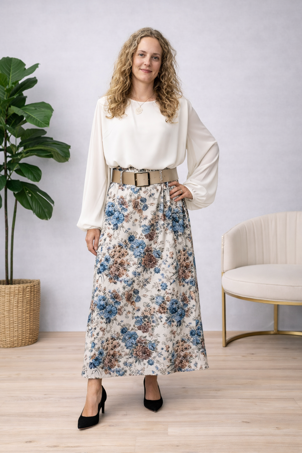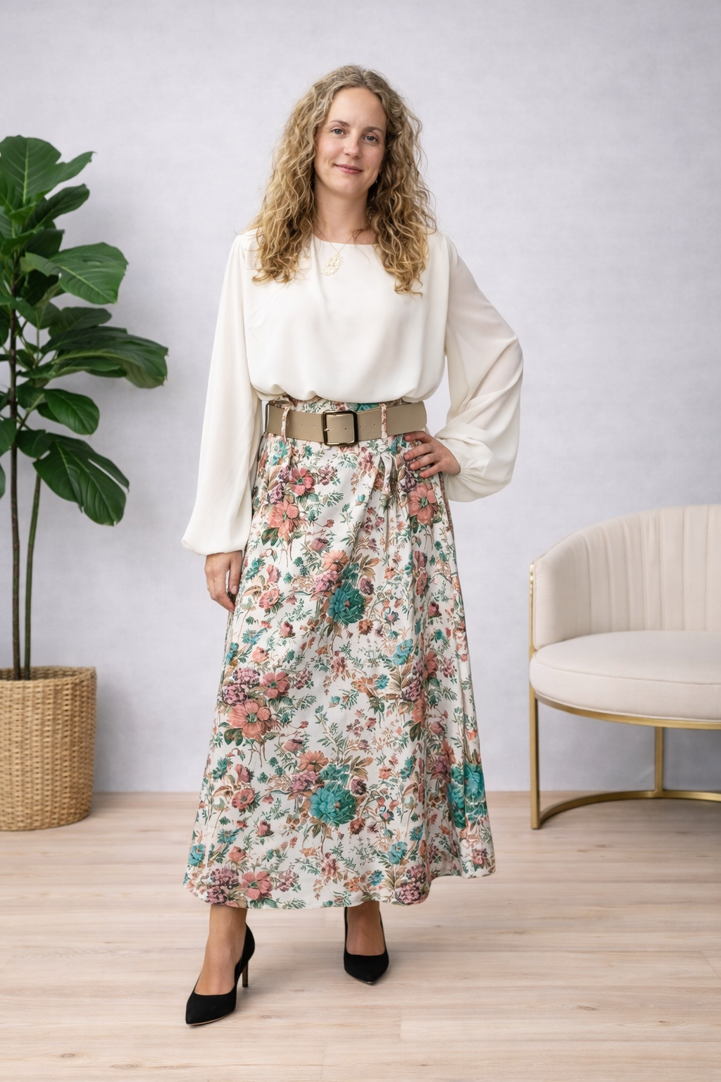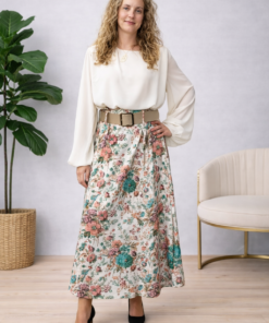 La falda Primavera es una prenda diseñada para aportar frescura, elegancia y versatilidad a cualquier look. Con un estampado floral delicado en tonos suaves y armoniosos, esta falda midi se convierte en una opción ideal tanto para el día a día como para ocasiones especiales.