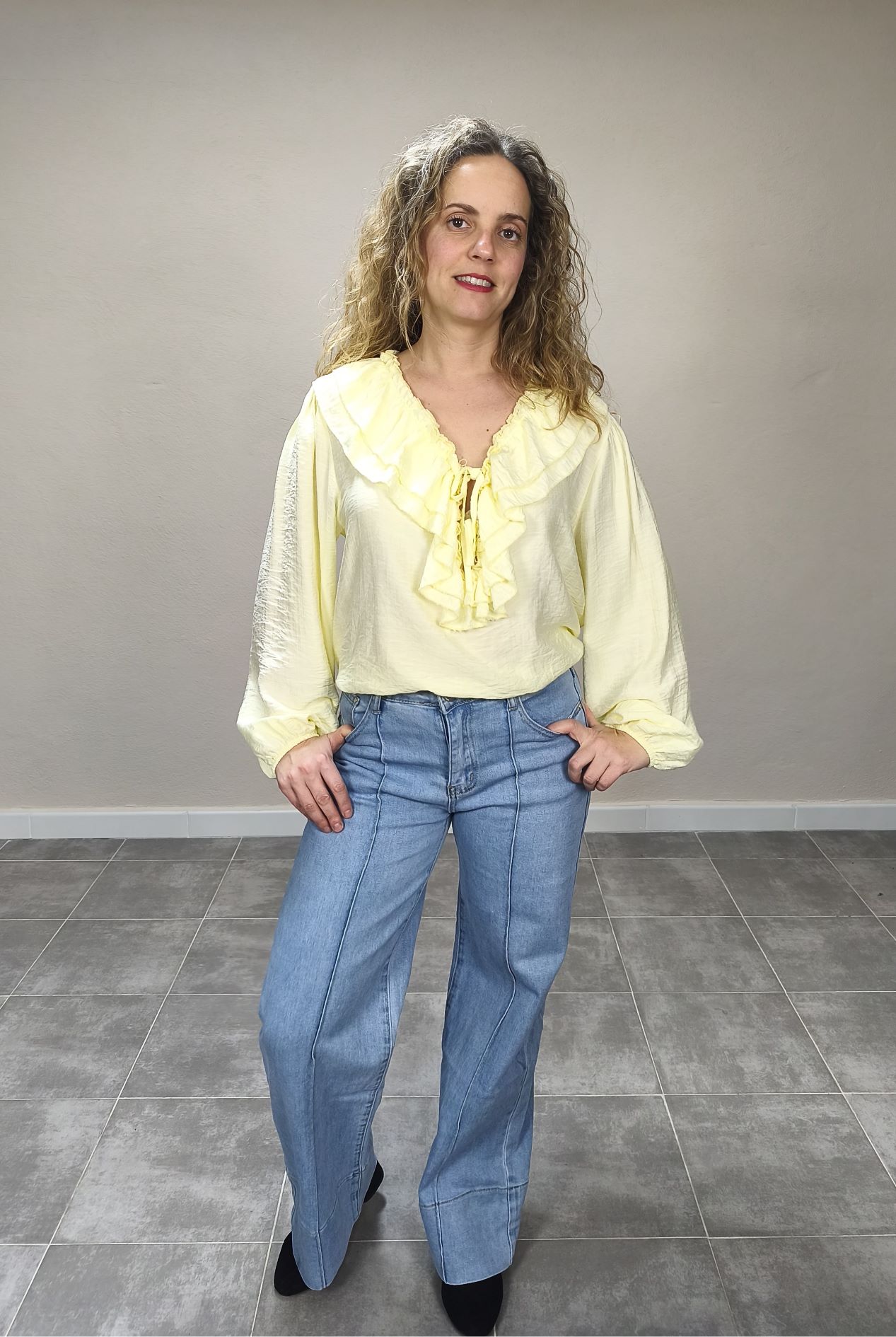 El pantalón vaquero Julia es la prenda perfecta para quienes buscan un equilibrio entre estilo, comodidad y versatilidad. Diseñado con un favorecedor corte wide leg, este pantalón se caracteriza por su silueta amplia y fluida desde la cadera hasta el bajo, creando una línea elegante que estiliza la figura y aporta un aire moderno y sofisticado a cualquier look.
