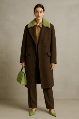 En la imagen, podemos ver un look que sintetiza la esencia de esta tendencia: un abrigo estructurado en tono chocolate, con solapa en verde pistacho y accesorios a juego. Una apuesta que redefine la elegancia invernal con un toque contemporáneo.